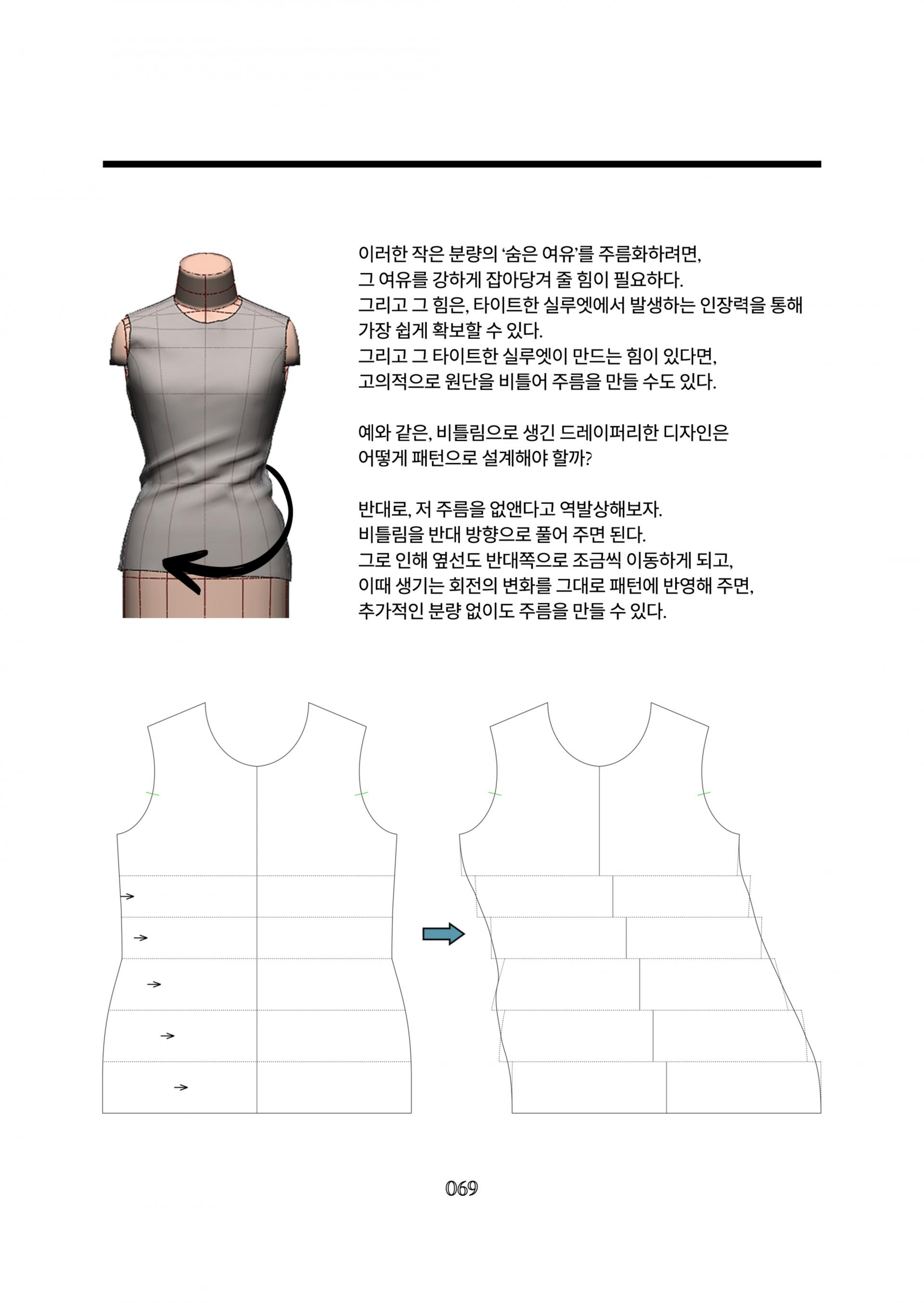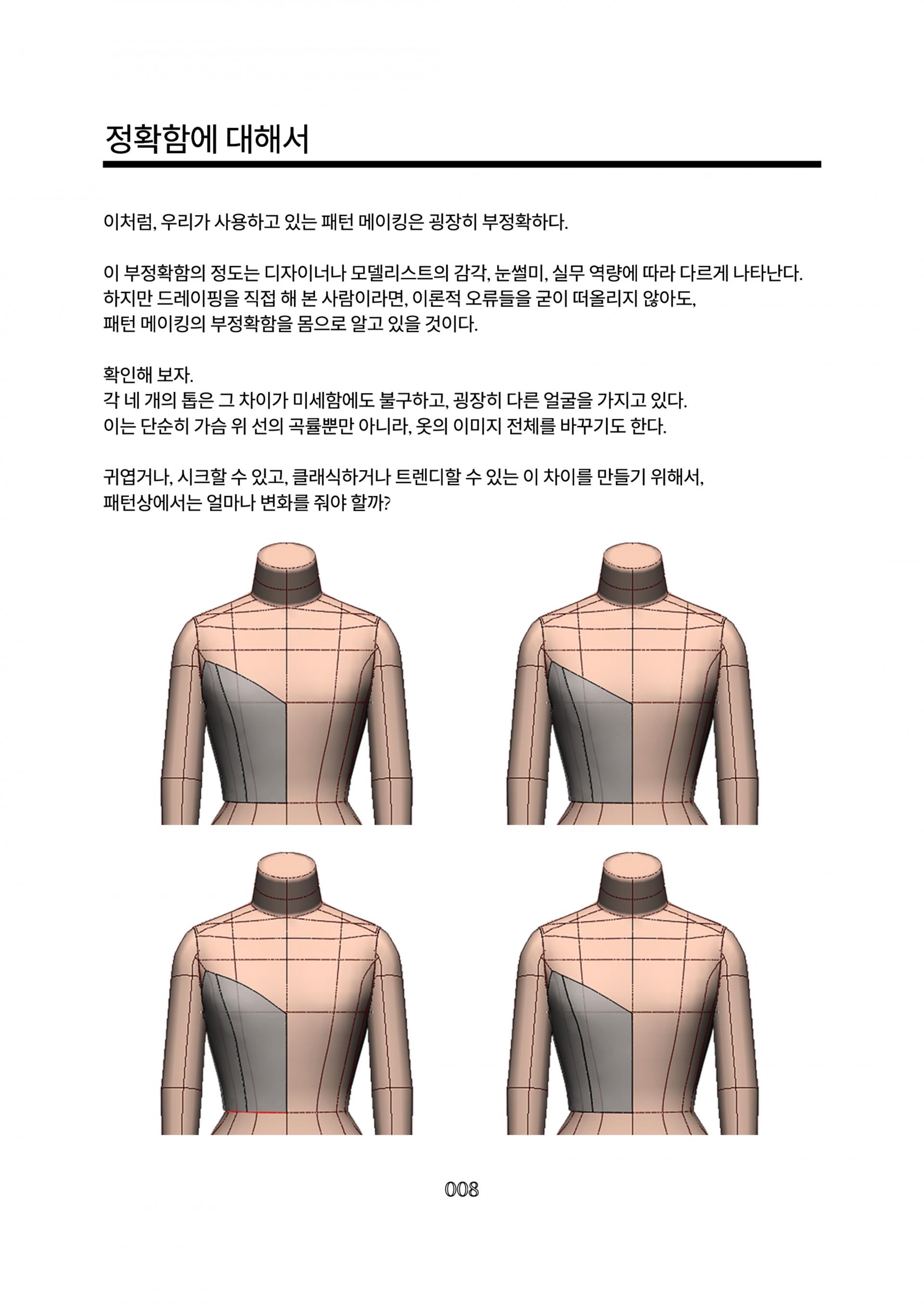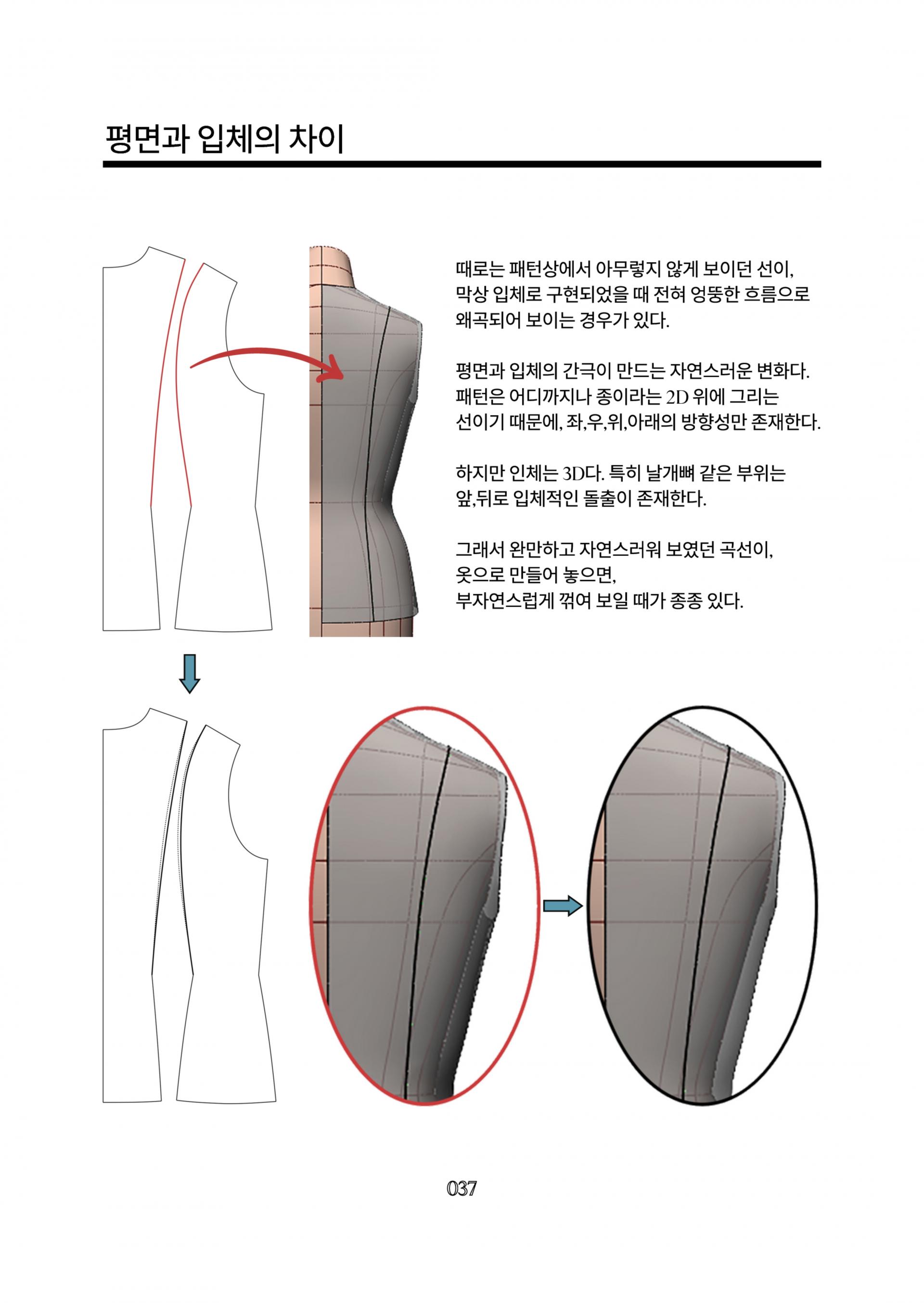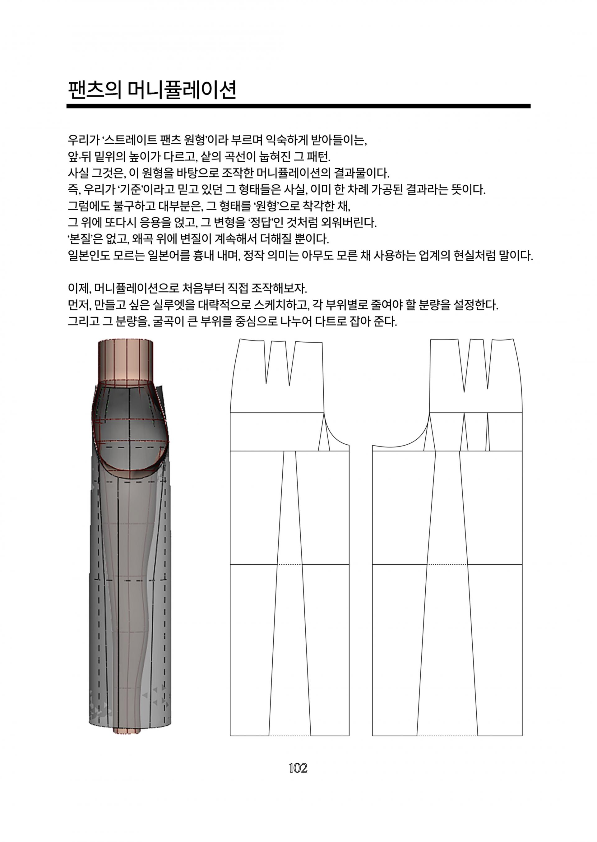 Q : 1권을 여러 번 읽으며 느낀 점은 다른 패턴책에서 소위 ‘의문사’당하던 지점을 탁월하게 메꾸어 준다는 것이었다. 패턴을 위한 패턴이 아니라, 옷을 위한 패턴을 이해하도록 한다는 점이 ‘패턴 이데아’ 시리즈가 여타 패턴 책에 비해 월등히 가지는 독자성이라 생각하는데, 무엇이 이러한 차이를 만들었다고 생각하는가?
