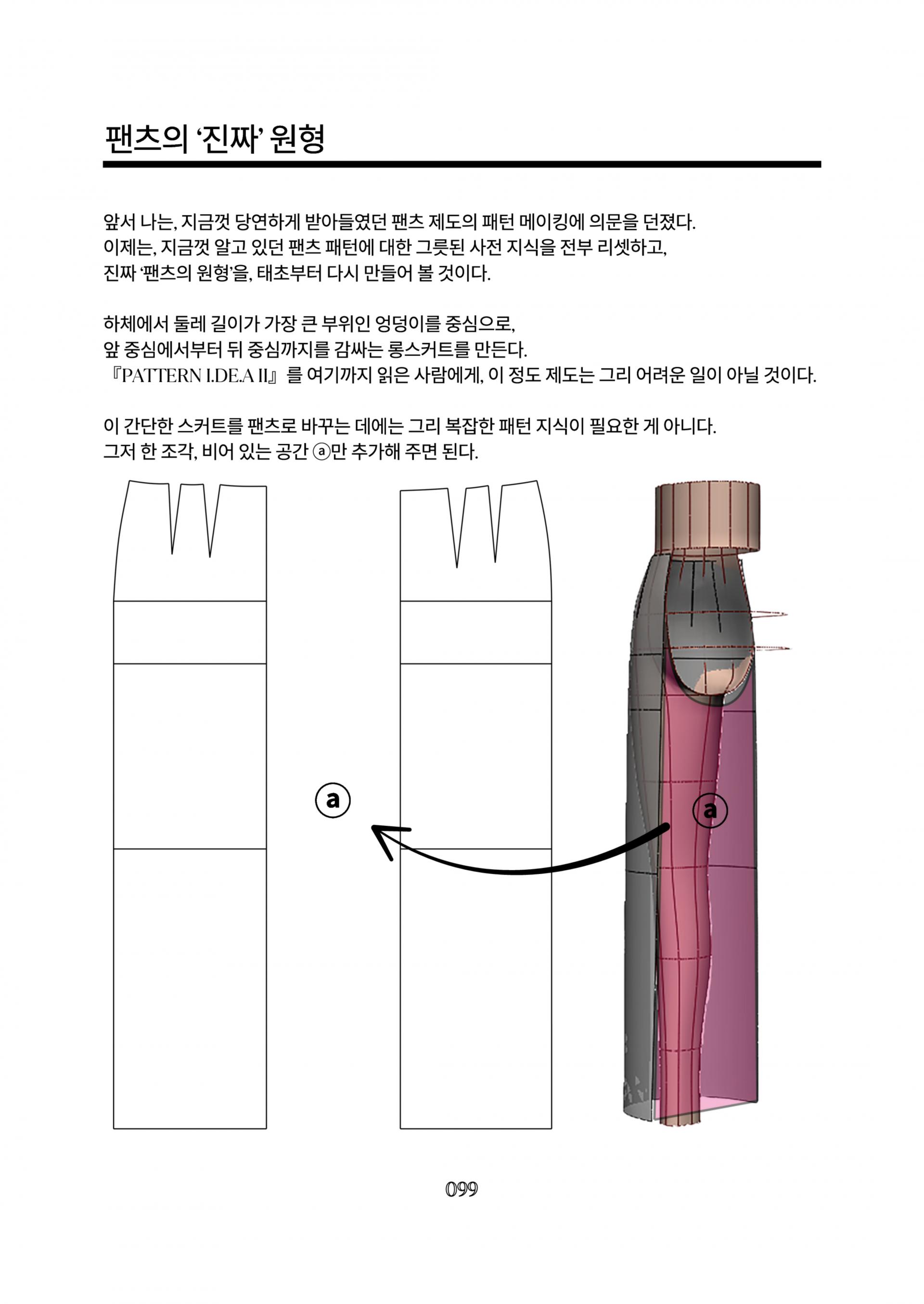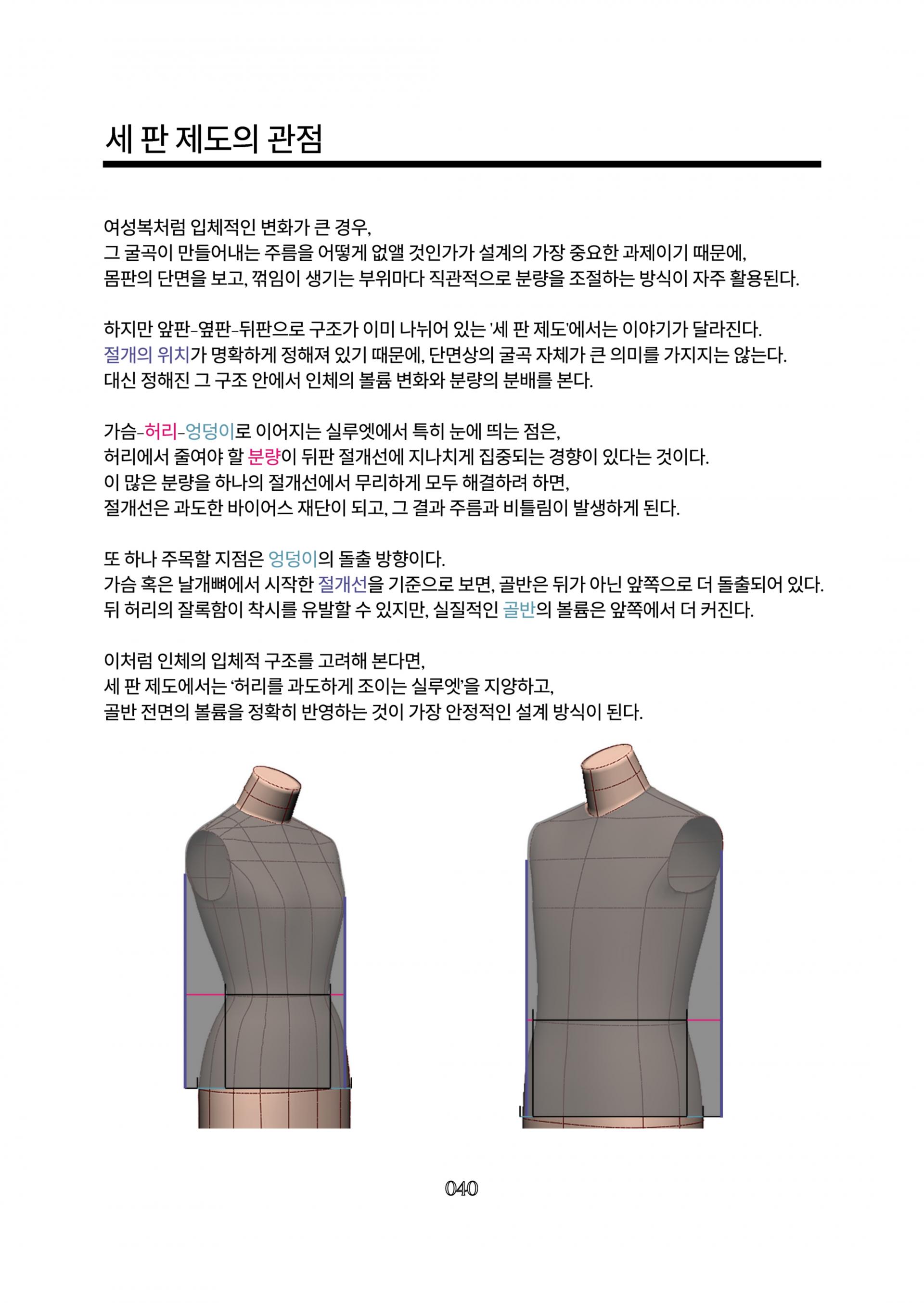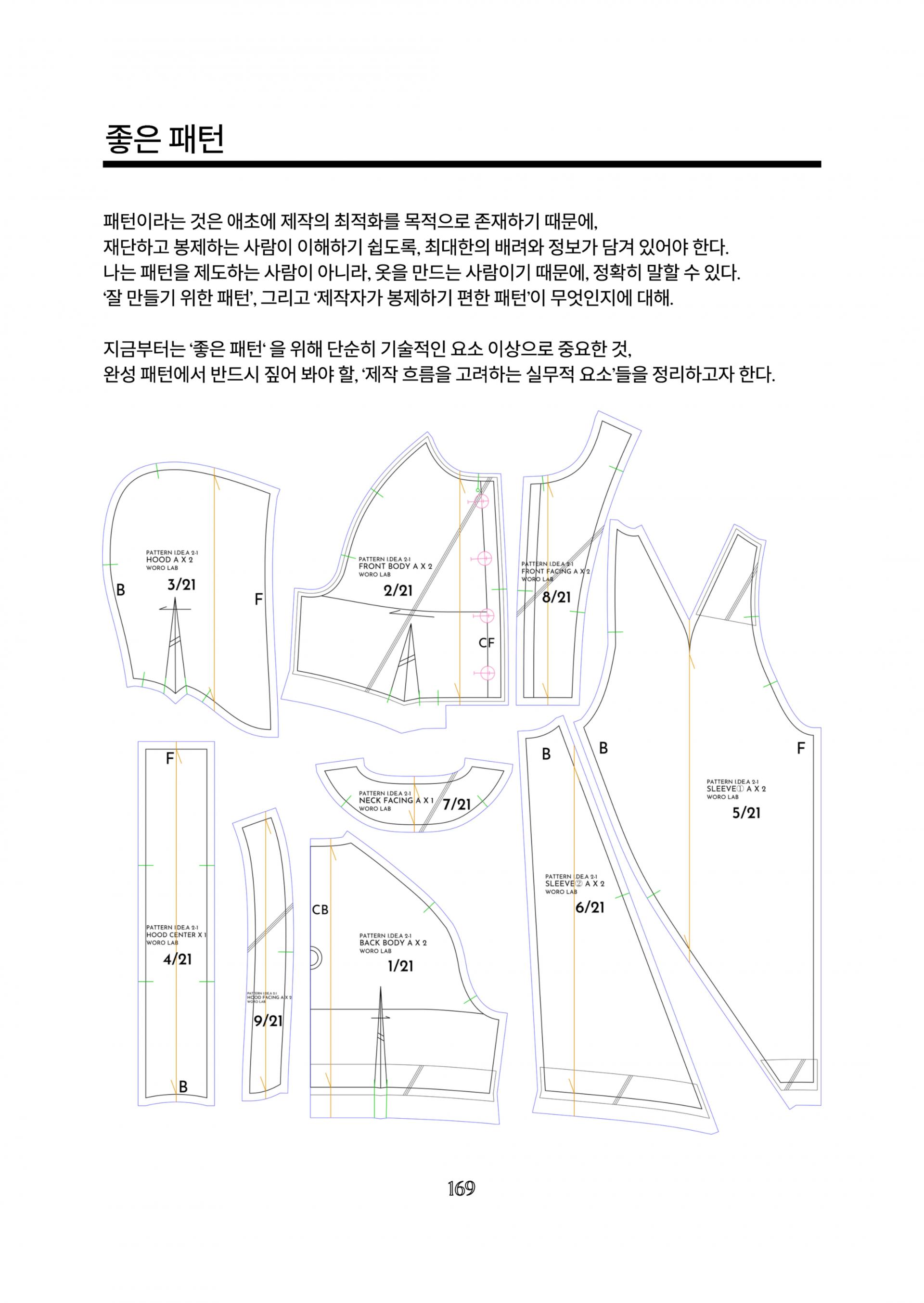 Q : 1권을 여러 번 읽으며 느낀 점은 다른 패턴책에서 소위 ‘의문사’당하던 지점을 탁월하게 메꾸어 준다는 것이었다. 패턴을 위한 패턴이 아니라, 옷을 위한 패턴을 이해하도록 한다는 점이 ‘패턴 이데아’ 시리즈가 여타 패턴 책에 비해 월등히 가지는 독자성이라 생각하는데, 무엇이 이러한 차이를 만들었다고 생각하는가?