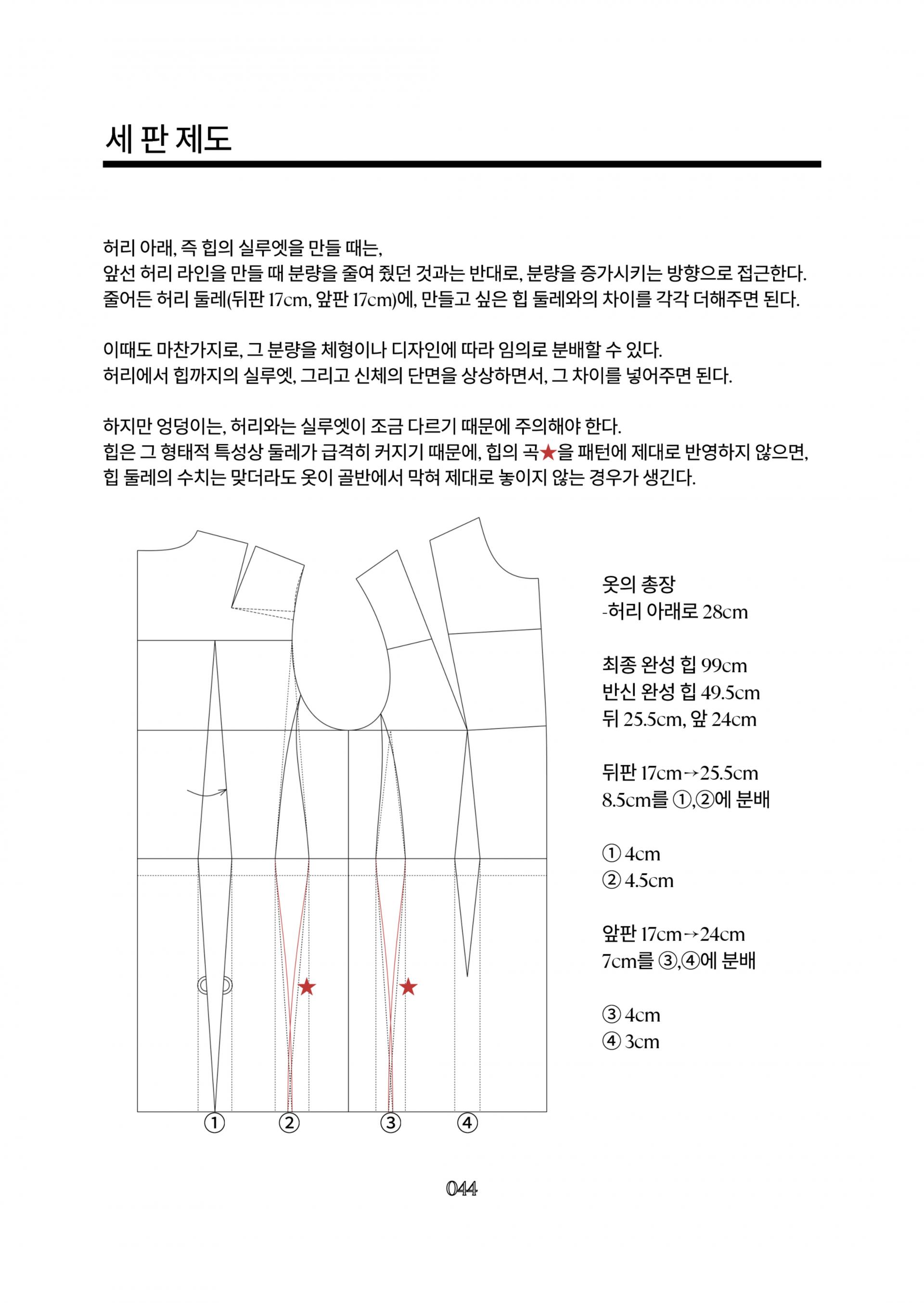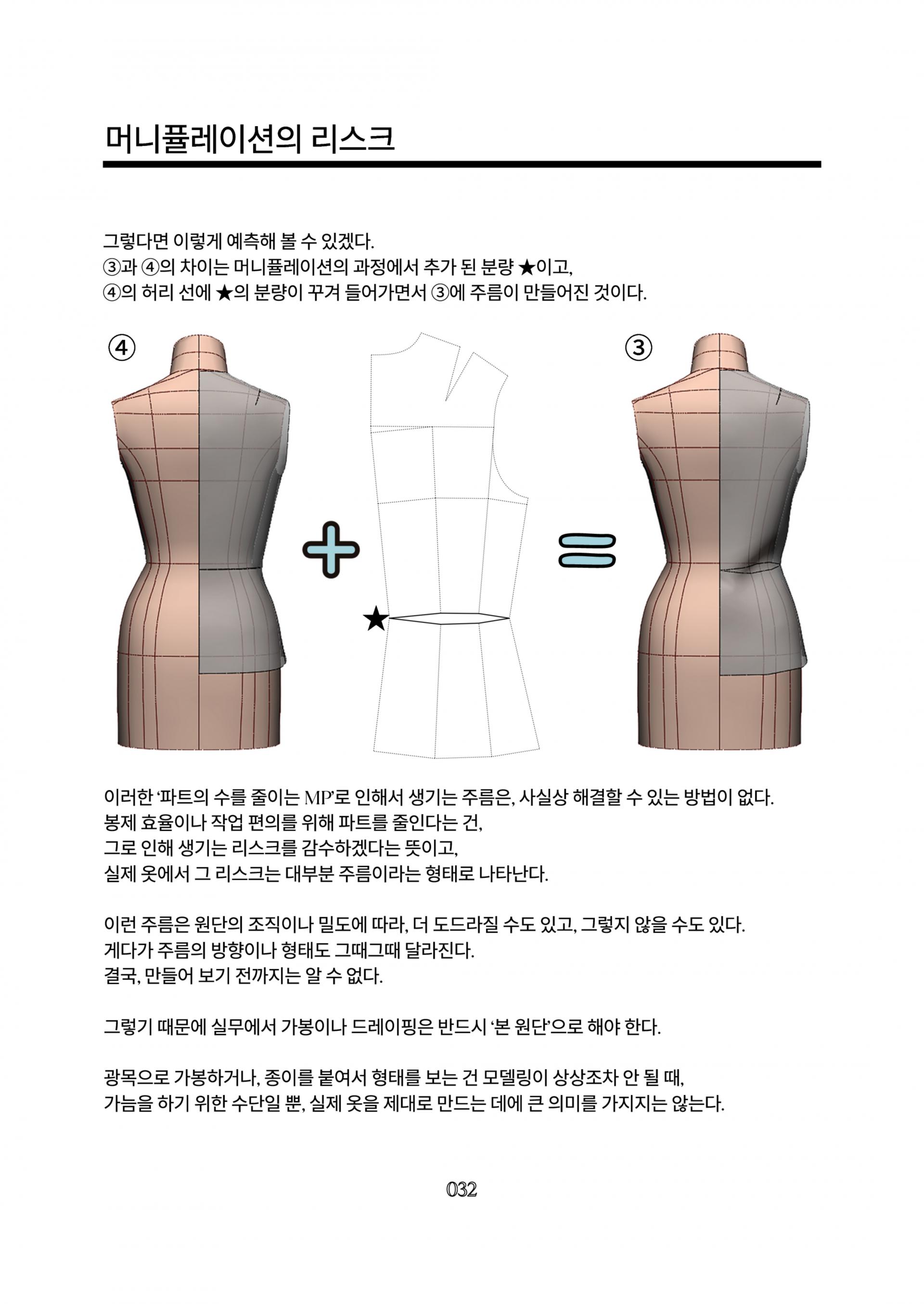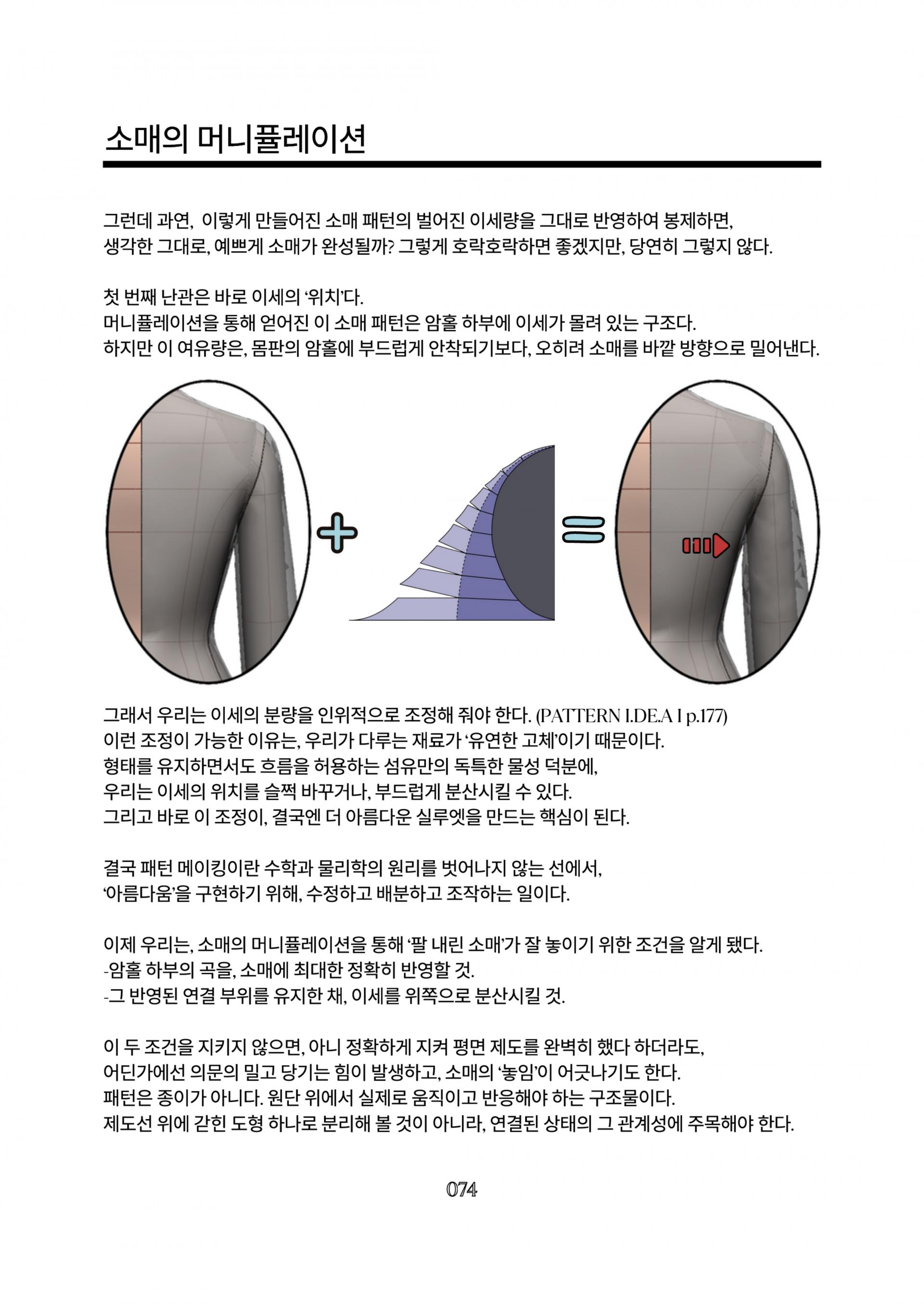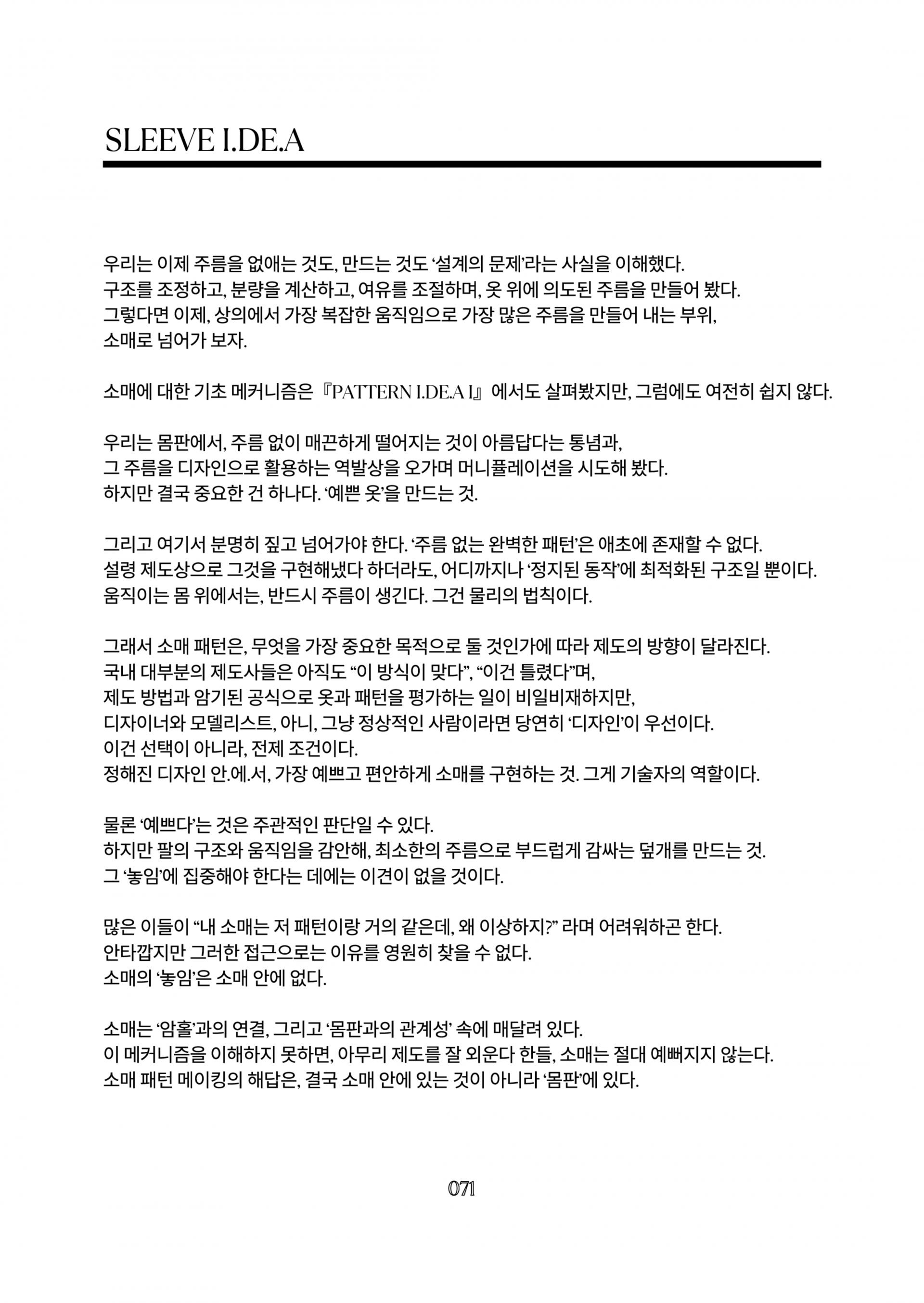 Q : 1권을 여러 번 읽으며 느낀 점은 다른 패턴책에서 소위 ‘의문사’당하던 지점을 탁월하게 메꾸어 준다는 것이었다. 패턴을 위한 패턴이 아니라, 옷을 위한 패턴을 이해하도록 한다는 점이 ‘패턴 이데아’ 시리즈가 여타 패턴 책에 비해 월등히 가지는 독자성이라 생각하는데, 무엇이 이러한 차이를 만들었다고 생각하는가?