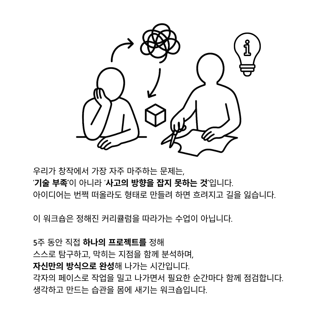 각자가 창의적인 작업을 하면서, 스스로 생각하고 풀어가는 습관을 만들어가는 시간입니다